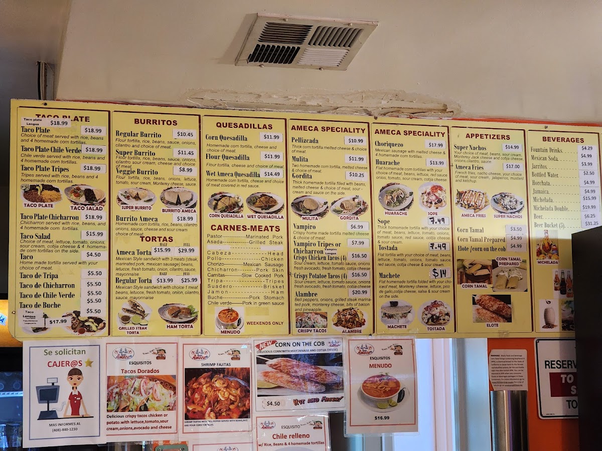 “ Tacos made with homemade tortillas are good here and the burritos here are really good. I had the nachos and I wouldn't order that again.. No cheese on their nachos... trust me, I was really looking for cheese...The parking here kinda sucks and it's hard to get in and out of the small, weird- shaped lot, so park at the liquor store and just walk to Ameca. ”